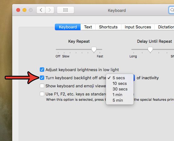 第 3 步:選中左側的框之後關閉鍵盤背光,然後單擊下拉菜單並選擇您希望鍵盤背光關閉的不活動時間段。