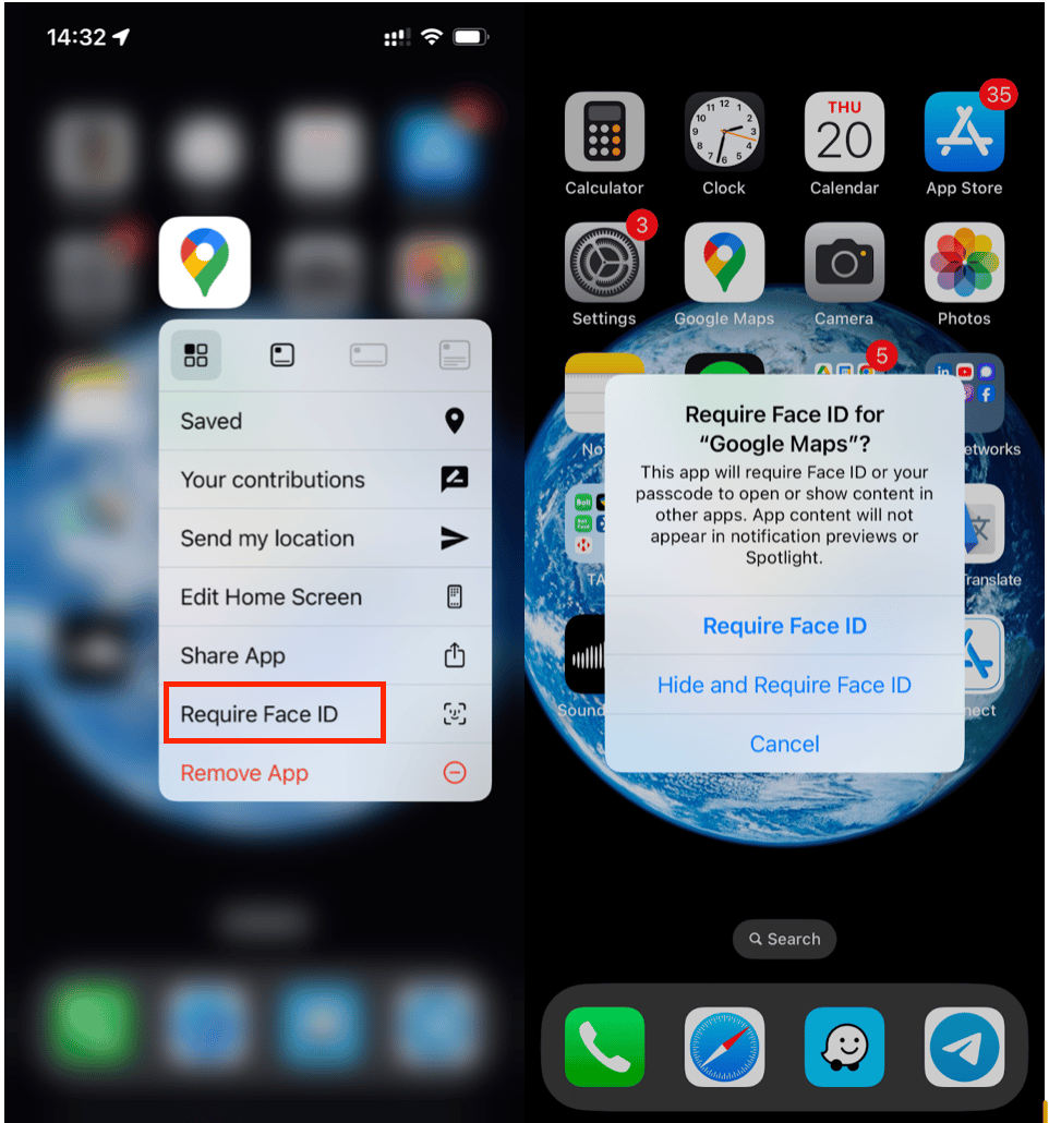 使用iOS 18,很容易鎖定iPhone上的任何應用程序。只需點擊並將應用程序圖標放在主屏幕上,然後選擇“需要面對ID”選項。從彈出菜單中,選擇“需要面對ID”,以確保只能打開應用程序。您也可以選擇“隱藏和需要面部ID”以鎖定應用程序並將其隱藏在主屏幕上。