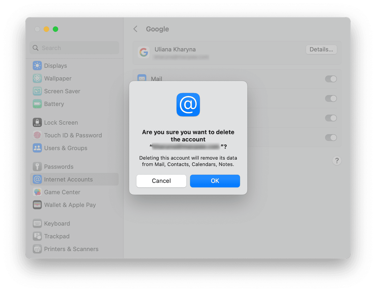 刪除帳戶後,您將無法再在 Mac 上通過該 Google 帳戶訪問 Gmail、通訊錄、日曆或記事。