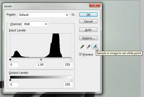 在 Photoshop 中將背景設為白色的一種方法是打開色階工具,選擇“圖像中的樣本以設置白點”選項,然後單擊背景中的一個點。