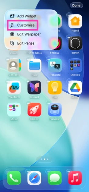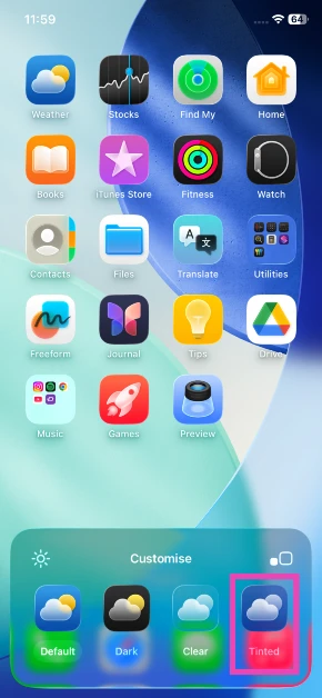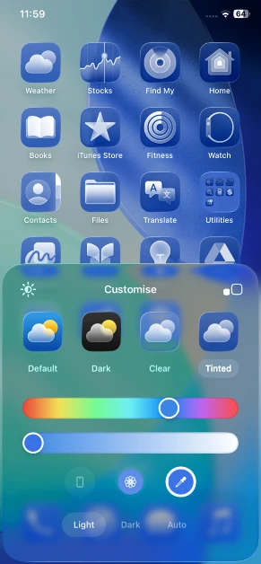長按主屏幕空白處,進入編輯>自定義>有色,點擊 iPhone 圖標,選擇淺色主題,然後點擊頁面上的任意位置以鎖定更改。