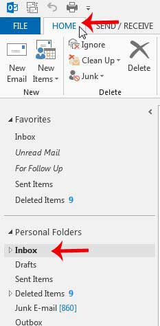 第 2 步:單擊家窗口頂部的選項卡。現在也是確保您位於要過濾的文件夾中的好時機。例如,如果您要查找收件箱中的電子郵件,請確保在窗口左側的文件夾列表中選擇收件箱。