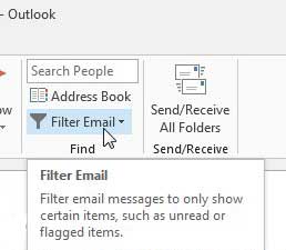 第 3 步:單擊過濾電子郵件按鈕在尋找窗口頂部的功能區部分。