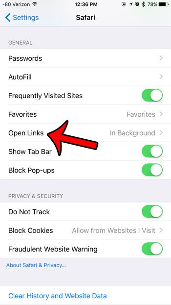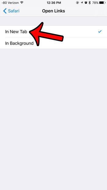 Safari 可以通過兩種不同的方式處理新選項卡中打開的鏈接。它可以在後台打開鏈接,這意味著該鏈接將作為新選項卡打開,但當前頁面將保留為您正在查看的頁面。準備好後,您可以瀏覽到後台選項卡。另一個選項是在新選項卡中打開鏈接,並將活動窗口切換到該新選項卡。我們下面的指南將向您展示如何調整 Safari 設置,以使“新標籤”選項成為您設備上的當前設置。