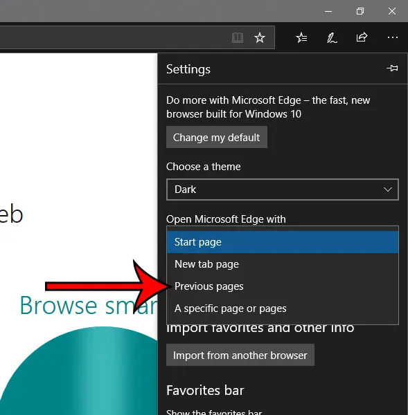 我們的指南在下面繼續提供有關如何使用上次關閉時打開的頁面重新啟動 Microsoft Edge 的其他信息,包括這些步驟的圖片。