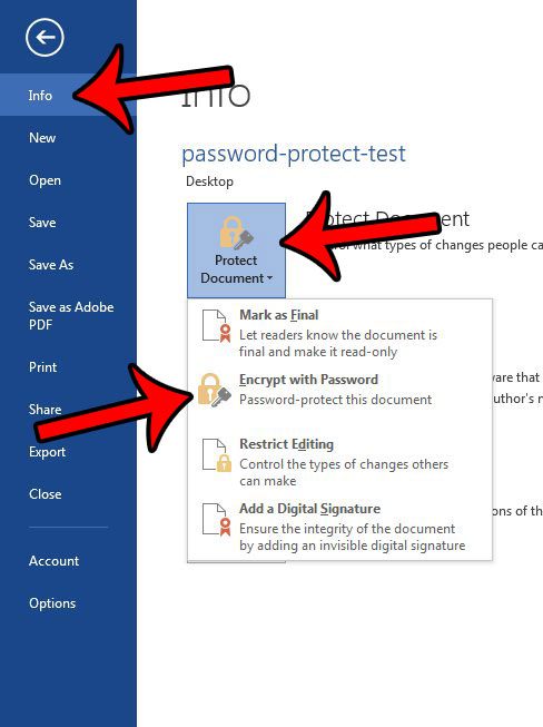 - 單擊資訊窗口左側的選項卡,單擊保護文檔,然後單擊使用密碼加密。