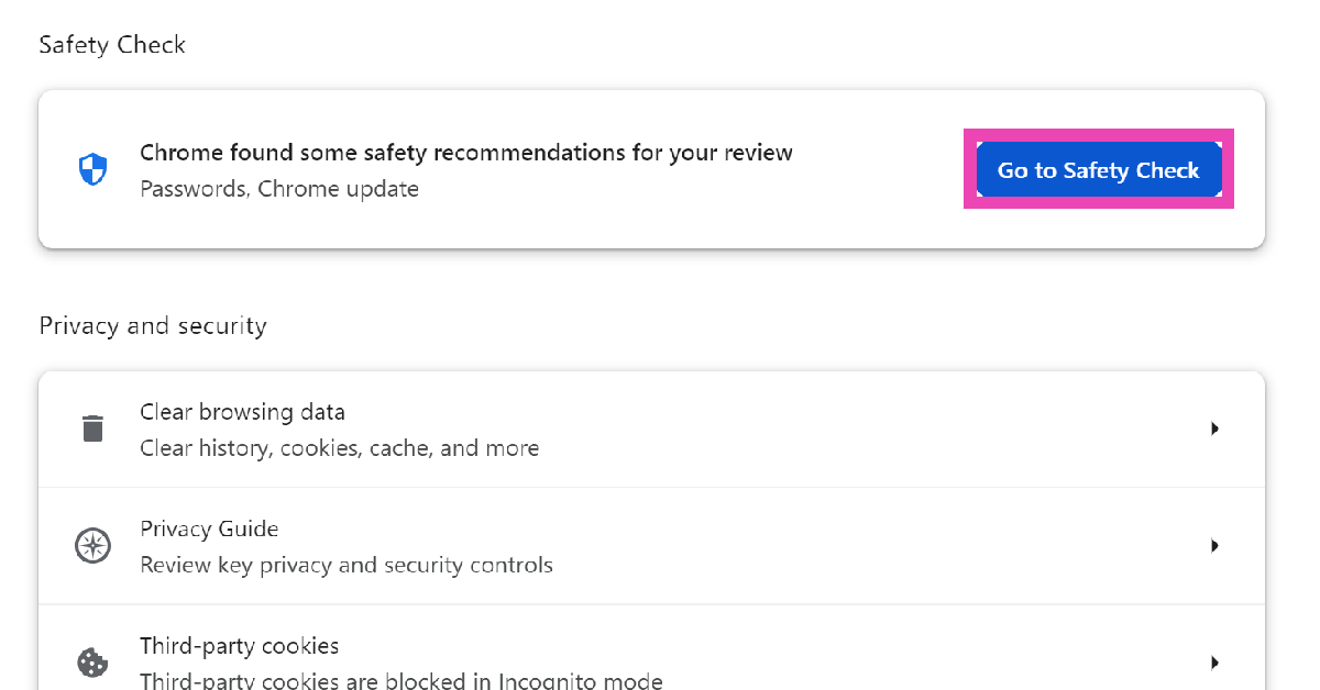 將 Safety Check 視為 Google Chrome 的隱私和安全儀表板。可以從瀏覽器的設置中訪問它。安全檢查跟踪在線安全的三個重要要素: