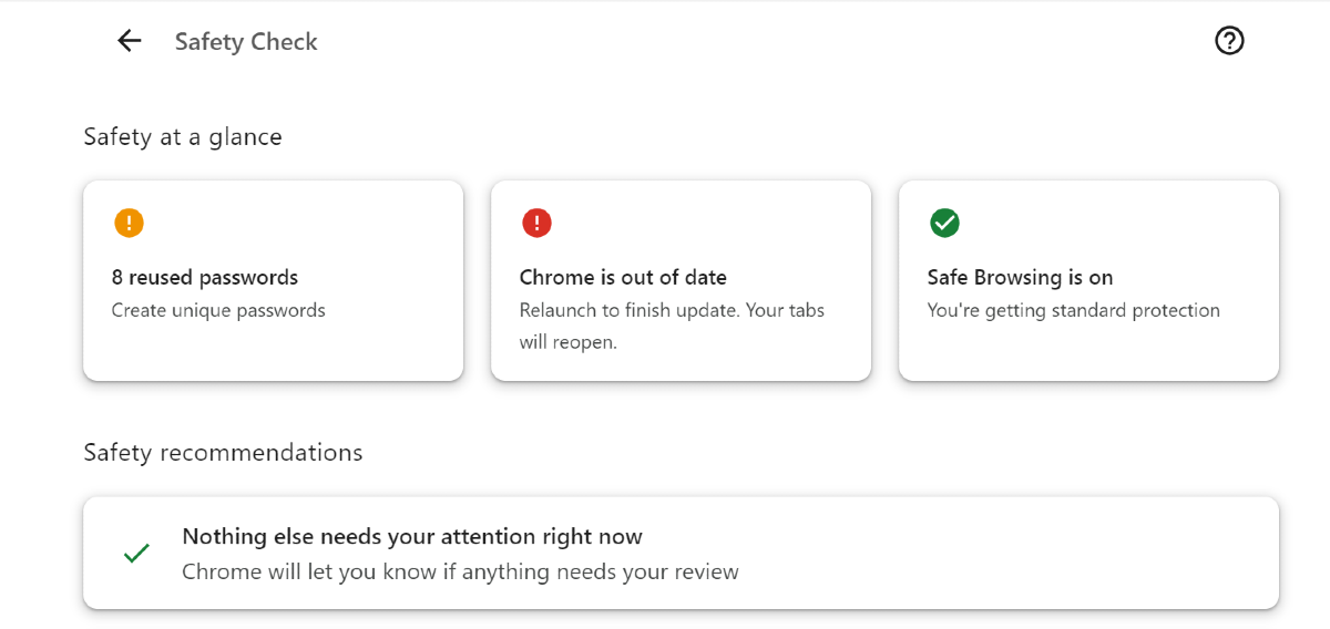 如果存在任何安全漏洞,安全檢查將標記該問題並在儀表板上通知您。當然,您可以採取更多步驟來增強瀏覽器的安全性,但這是練習的一個很好的切入點。