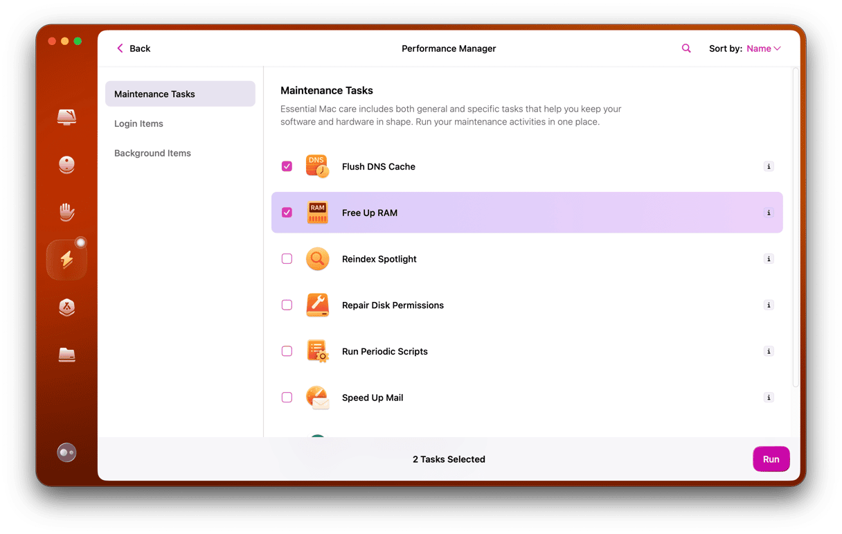 無論您選擇哪種方法在 Mac 上玩 32 位遊戲,最好確保它盡可能快速、流暢地運行。一種方法是進行定期維護。維護您的 Mac 意味著運行 macOS 維護腳本、釋放 RAM、重新索引 Spotlight 以及清除可清除的磁盤空間。手動完成所有這些工作將需要相當長的時間,而且並不容易——macOS 維護腳本需要終端命令才能運行。
