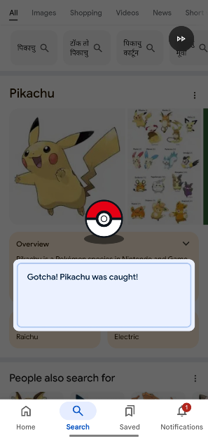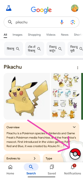 要捕捉神奇寶貝,請在 Google 中搜索其名稱,然後點擊屏幕右下角的神奇寶貝球。