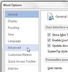 第 4 步:單擊先進的左欄中的選項卡單詞選項窗戶。