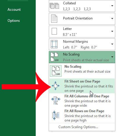 幸運的是,Excel 2013 中的“打印”菜單上有一個選項,只需單擊一個按鈕即可將整個工作表打印在一頁上。