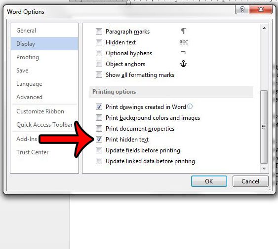 第 5 步:向下滾動到打印選項該菜單部分,然後單擊左側的框打印隱藏文本。然後您可以單擊好的窗口底部的按鈕以應用更改。