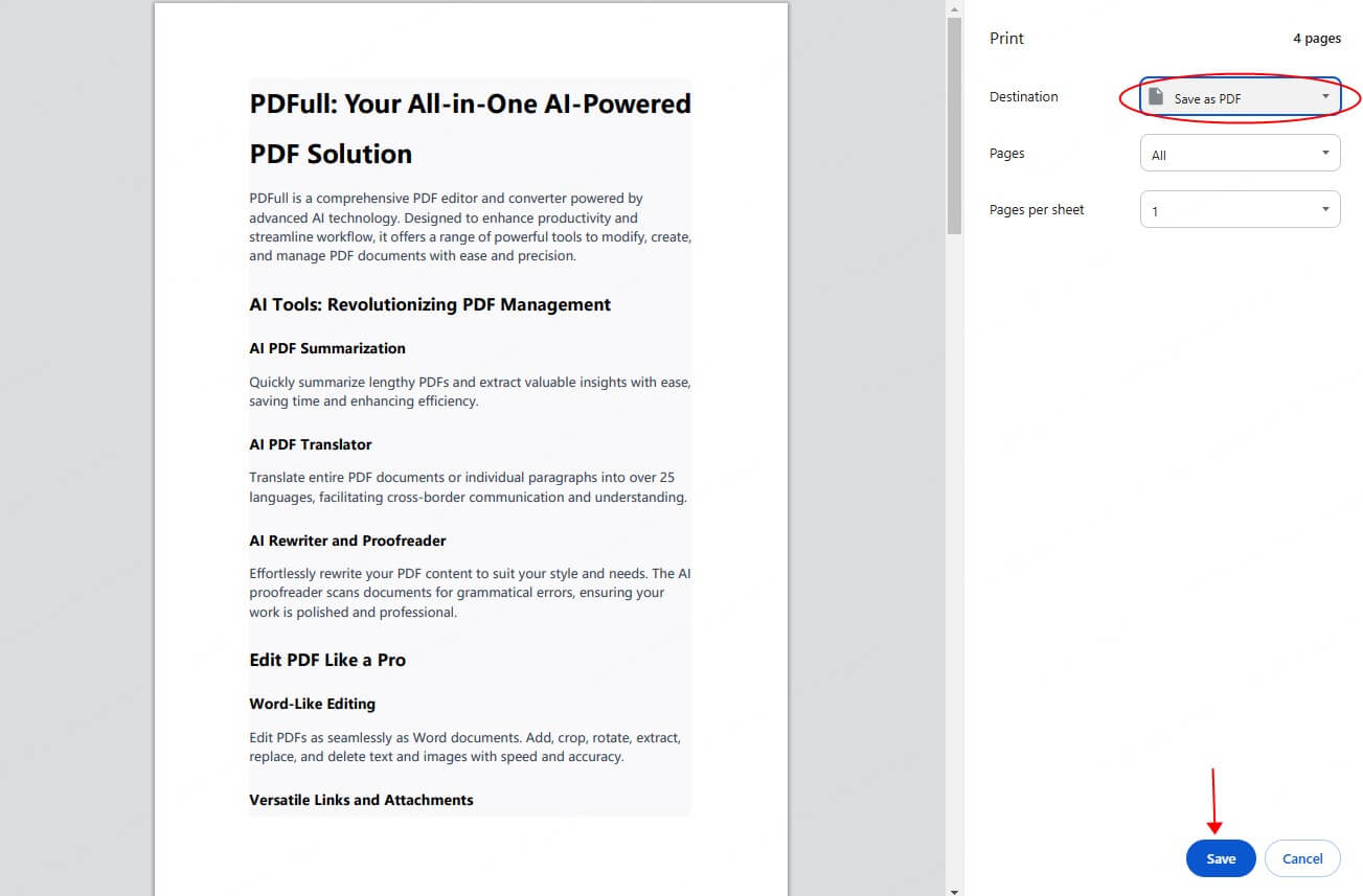 確保目的地是“另存為 PDF”,然後單擊“節省”來打印文檔。
