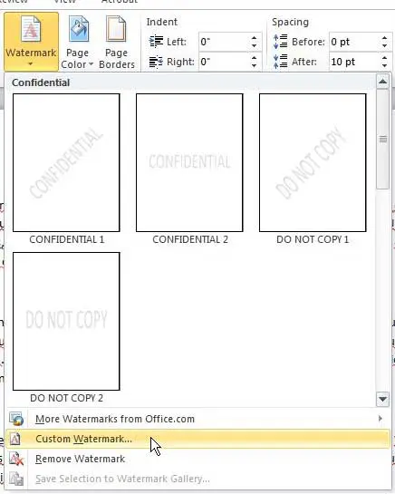 第 3 步:單擊水印下拉菜單中頁面背景窗口頂部功能區的部分,然後單擊自定義水印選項。