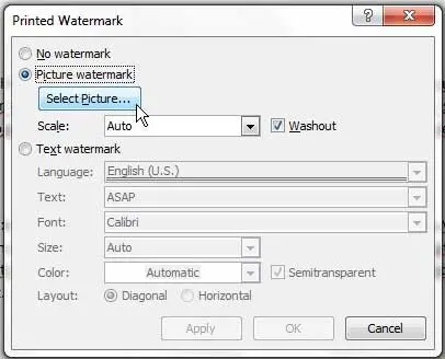 第 4 步:選擇圖片水印窗口頂部的選項,然後單擊選擇圖片按鈕來選擇要放在 Word 2010 中的文本後面的圖像。