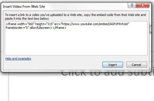許多較新的應用程序只需使用視頻鏈接(而不是嵌入代碼)即可嵌入 YouTube 視頻。例如,在 Office 365 的 Powerpoint 中,您只需轉到插入 > 視頻 > 在線視頻然後將 YouTube 視頻的地址粘貼到字段中,然後單擊“插入”按鈕。但是,無法通過該對話框搜索視頻,因此您需要在網絡瀏覽器中找到所需的 YouTube 視頻,然後從窗口頂部的地址欄中復制並粘貼視頻地址。