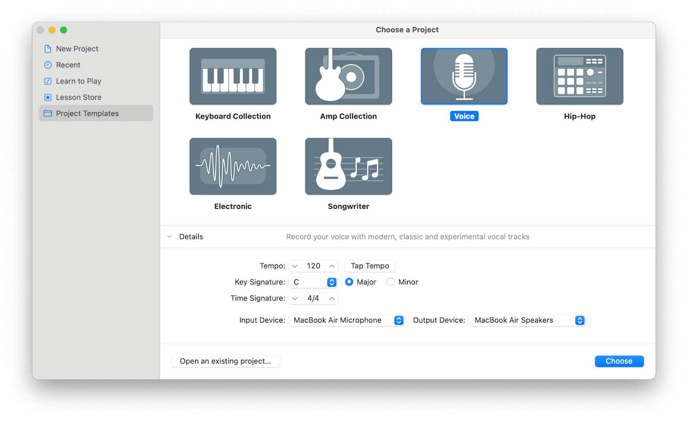 在“選擇項目”窗口的底部,選擇要用於錄製音頻的輸入。