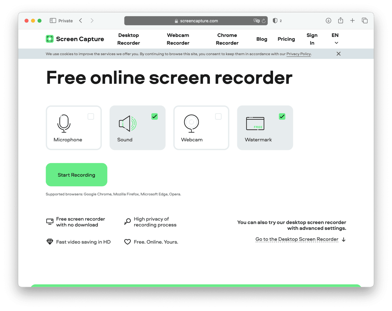 單擊麥克風。如果您還想錄製 Mac 的音頻,請選中“聲音”;否則,取消選中它。免費版本screencapture.com在錄音上添加水印。如果您想通過取消選中水印框來刪除它,則需要付費。