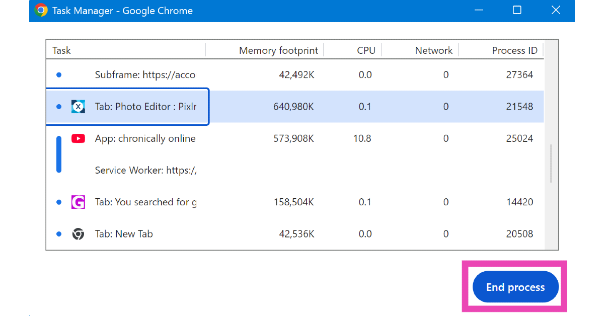 您可以通過清除 RAM 來提高 PC 上 Google Chrome 的速度。在 Chrome 中按“Shift + Esc”打開其任務管理器,選擇佔用內存最多的任務,然後結束其進程。