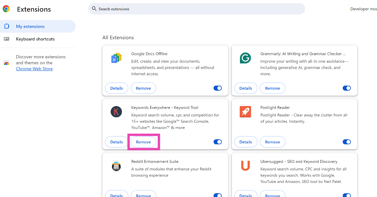 保留不再使用的擴展程序可能會降低 Google Chrome 的速度。損壞的擴展可能會干擾日常任務並導致故障。單擊地址選項卡旁邊的拼圖圖標即可查看已安裝的擴展。點擊您想要卸載的程序旁邊的省略號,然後選擇“從 Chrome 中刪除”。或者,點擊省略號,轉到擴展>管理擴展,然後在您要卸載的擴展上點擊“刪除”。