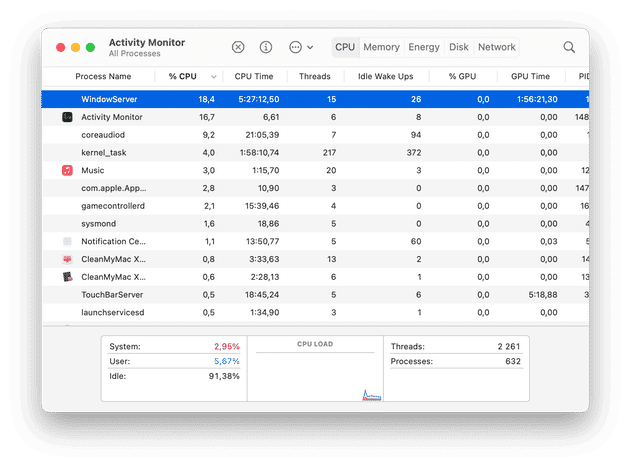 - 如果 WindowServer 接近頂部並且佔用了超過 60% 的 CPU 資源,您就知道它使用了比應有的更多的 CPU 週期。