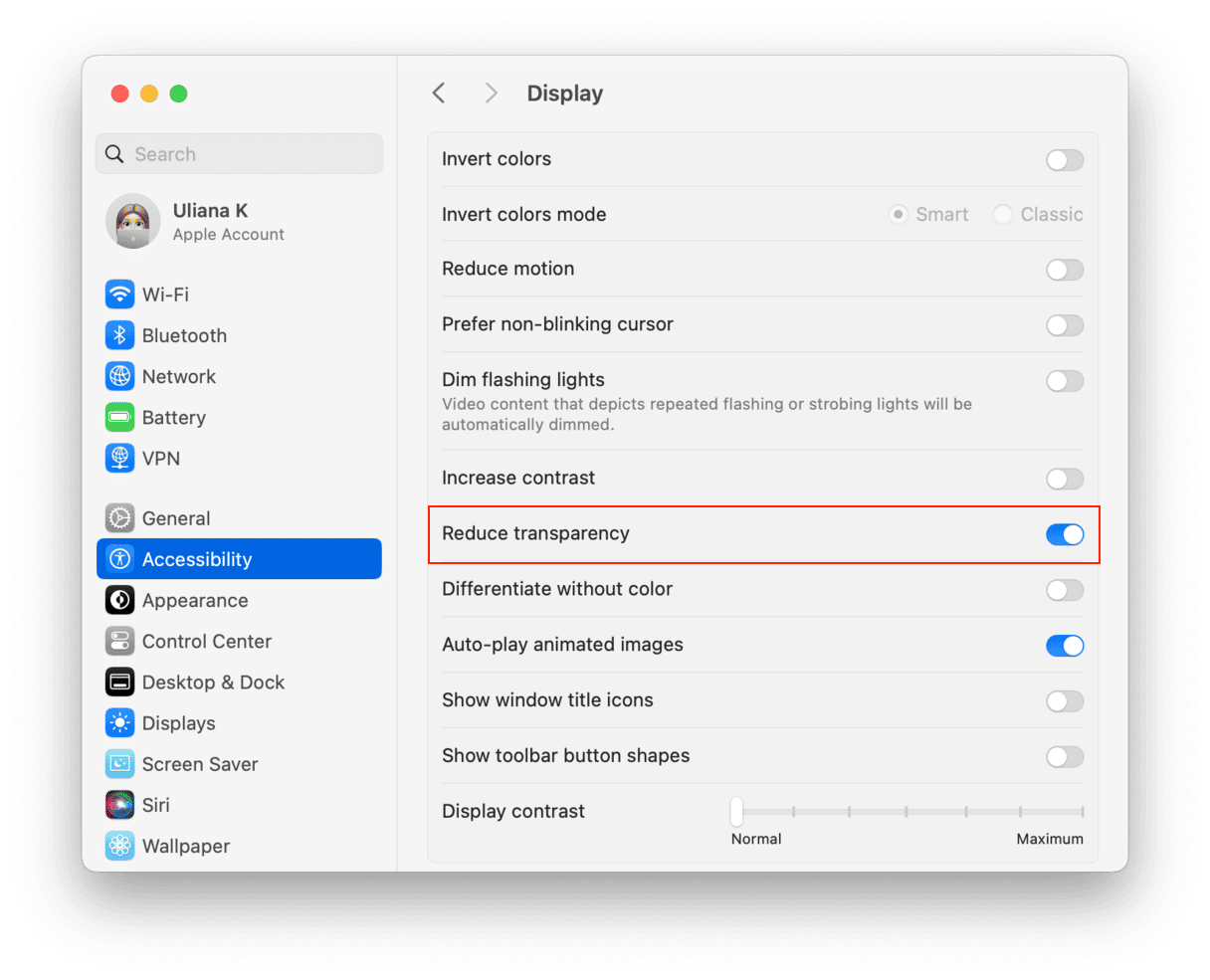 窗口中的透明度等功能也會使用更多的 CPU 週期。您無法關閉所有視覺效果,但可以使用“系統設置”中的“輔助功能”窗格關閉透明度。要將其關閉: