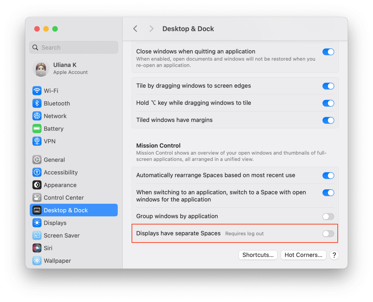 如果您使用多個顯示器,則需要關閉它們的 Spaces。幸運的是,這可以通過系統設置輕鬆完成: