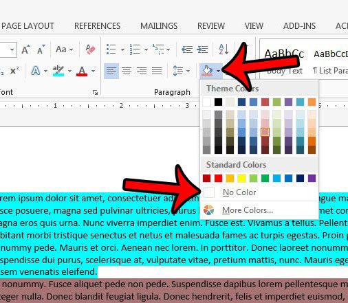 如前所述,這可能不會刪除文本後面的突出顯示/陰影顏色。如果沒有,則應用段落底紋。您可以通過單擊右側的箭頭將其刪除陰影按鈕在段落功能區部分,然後單擊無顏色選項。