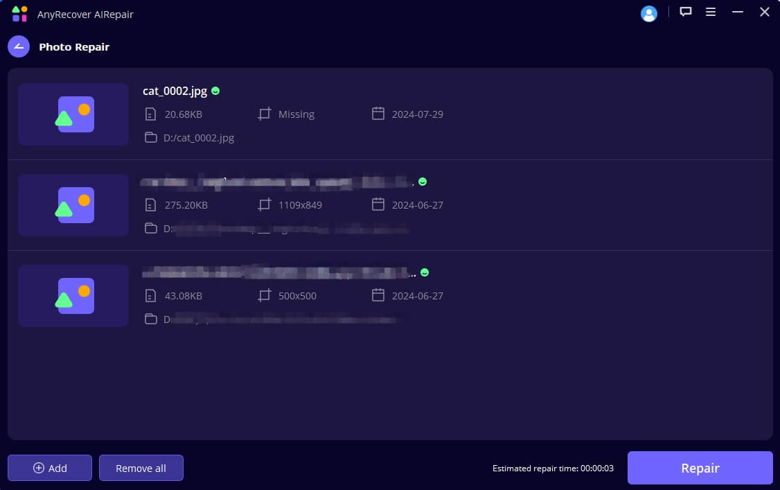 對於更高級的 JPG/JPEG 文件修復,免費下載應用程序 AIRepair 可能是最佳選擇。與網上相比在線修復JPEG/JPG文件工具,它不僅可以修復嚴重損壞的 JPG/JPEG 文件,還可以同時修復多個較大尺寸的圖像文件。