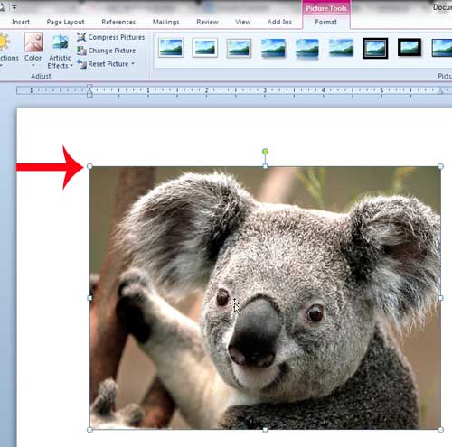 步驟 3:單擊圖像一角的一個框,如果您想讓圖像變小,則將該框拖入,或者將該框拖出以使圖像變大。請注意,圖像的每一側都有方框,但拖動這些方框也會改變圖片的縱橫比,這可能會使其看起來扭曲。