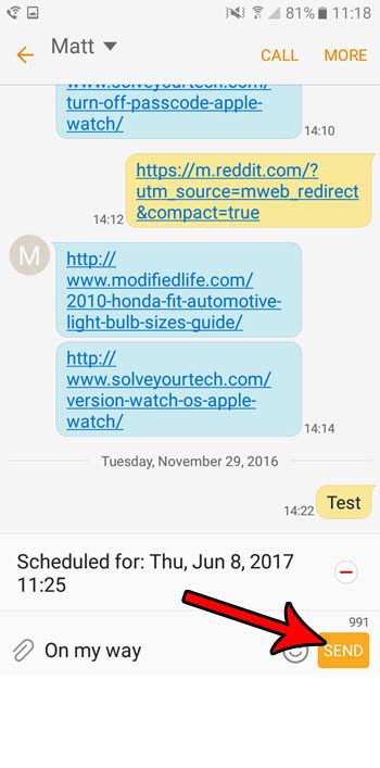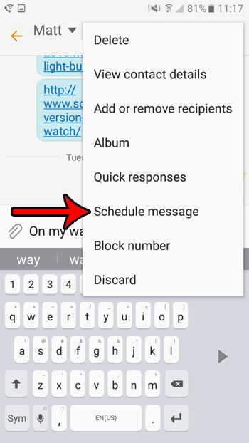 此方法在手機上的默認消息應用程序中進行,並遵循與發送常規短信相同的許多步驟。但是,您可以選擇單獨的“計劃消息”選項,您可以在其中指定消息的時間和日期。 Android 將在您選擇的時間繼續發送消息。
