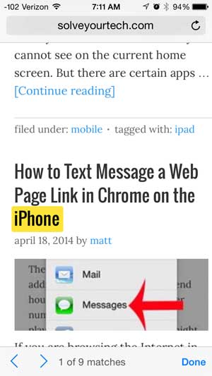 Safari 將以黃色突出顯示搜索詞的每個實例。您可以按頁面左下角的箭頭鍵在出現的搜索詞之間導航,然後可以按“完成”退出此模式。
