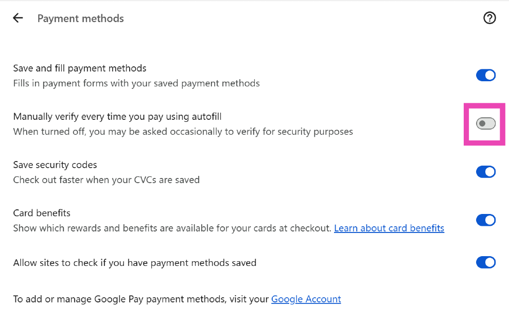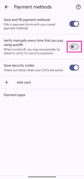第5步:打開旁邊的切換開關每次使用自動填充付款時手動驗證。