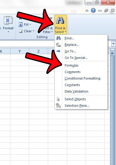 第 3 步:單擊查找並選擇按鈕在編輯Office 功能區的部分,然後單擊公式選項。