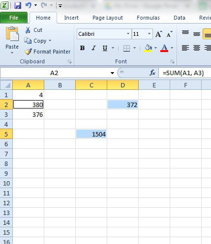 Excel 將自動選擇電子表格中的第一個公式,然後包含公式的其餘單元格將以藍色突出顯示。例如,在下圖中,單元格A2,C5, 和D2都包含公式。公式在A2被選中是因為它首先出現。您可以通過按在突出顯示的單元格之間循環進入鍵盤上的鍵。