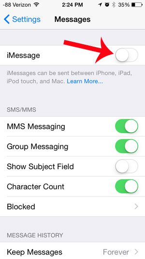 完成本文中的步驟後,您將在 iPhone 5 上禁用 iMessage。這意味著您的所有消息都將以短信形式發送。您可以在本文中詳細了解藍色消息 (iMessage) 和綠色消息 (SMS) 之間的區別。