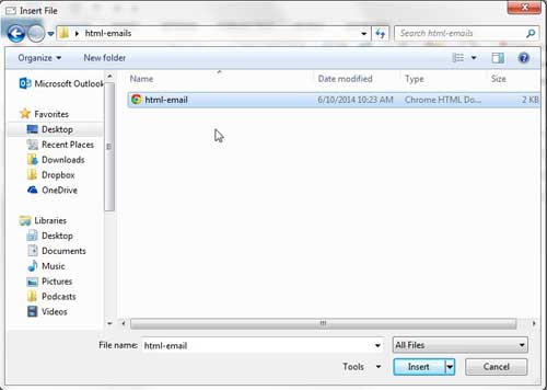 步驟 4:瀏覽到計算機上要包含為電子郵件正文的 HTML 文件,然後單擊一次將其選中。