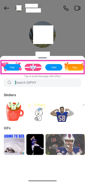 在文本框中輸入消息,點擊放大鏡圖標,然後從頂行選擇特殊效果。特殊效果不適用於長消息。