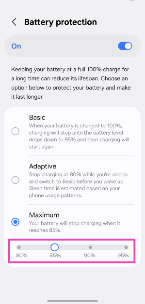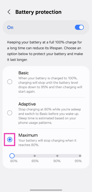 在您的三星手機上,轉至設置>電池>電池保護,打開切換開關並點擊“最大值”。將滑塊設置為 80%。