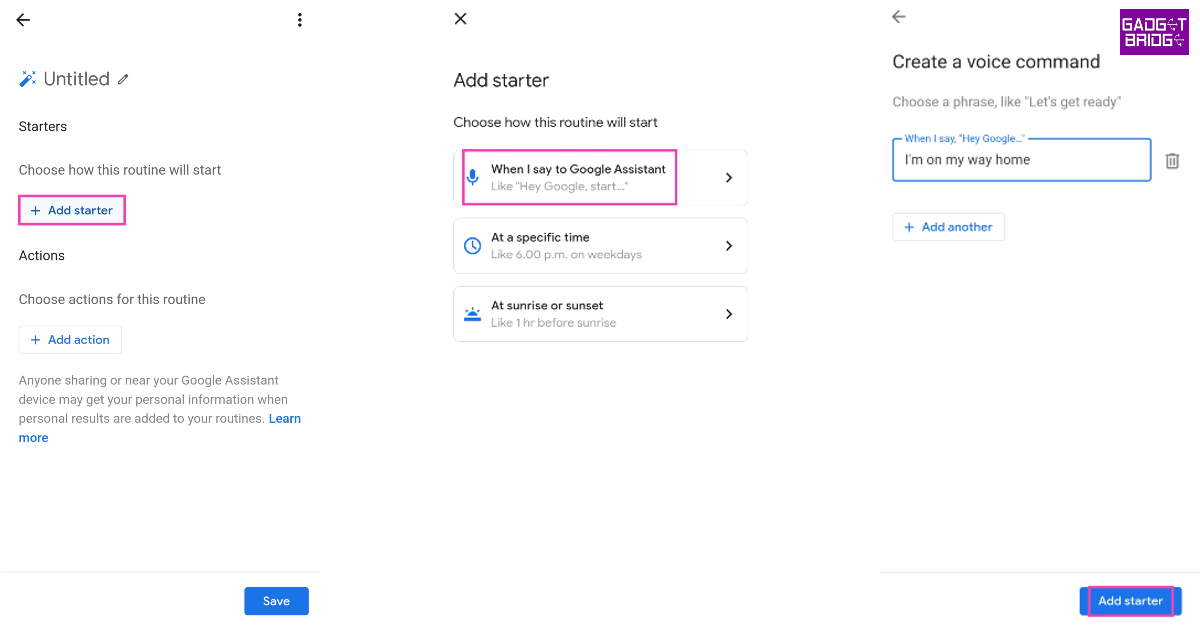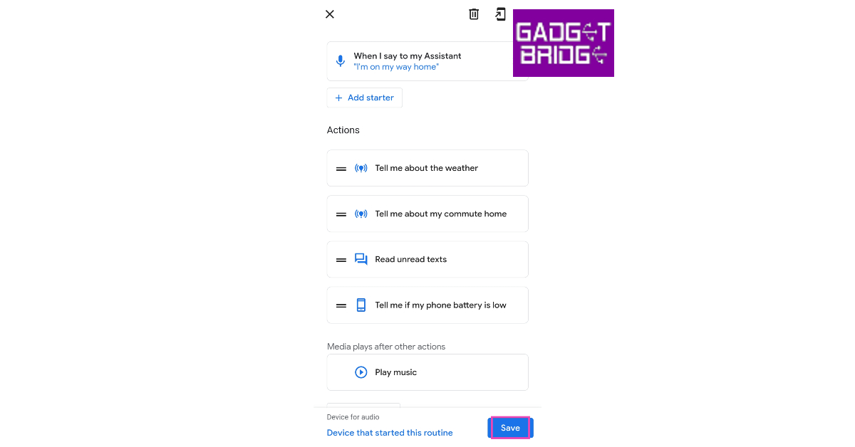 步驟8:點擊“添加啟動器”。這將成為您日常工作的觸發器。您可以將例程設置為在一天中的特定時間或當您對 Google Assistant 說出某個短語時開始。