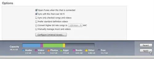 滾動到摘要屏幕的底部,選中左側的框通過 Wi-Fi 與此 iPad 同步,然後單擊申請按鈕位於窗口右下角。
