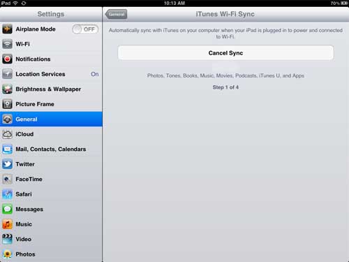 點擊設定iPad 主屏幕上的 圖標,觸摸一般的屏幕左側的選項,然後點擊iTunes Wi-Fi 同步在屏幕中央。