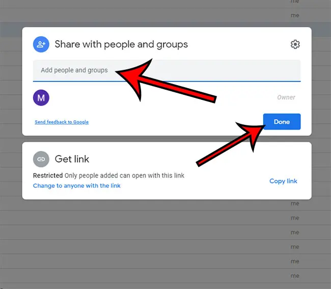 您可以通過登錄雲端硬盤、單擊文件、單擊文件列表右上角的“共享”按鈕,然後添加人員或 Google 群組並單擊“完成”來共享 Google 雲端硬盤中的文件。