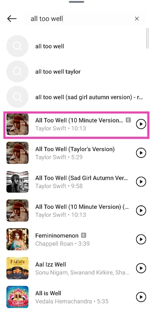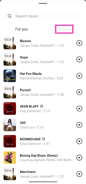 當您將歌曲片段添加到您的故事、筆記或個人資料中時,Instagram 允許您從歌曲中選擇特定片段。您可以將搜索標準拖到您喜歡的段或選擇預設段之一。但是,此選項在 Instagram DM 的音樂貼紙中不可用。當您選擇歌曲標題時,預先選擇的片段將發送到聊天室。