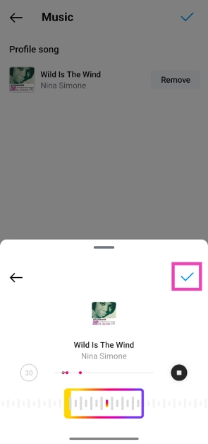 步驟12:點擊藍色勾號屏幕右上角的圖標可將歌曲添加到您的個人資料中。
