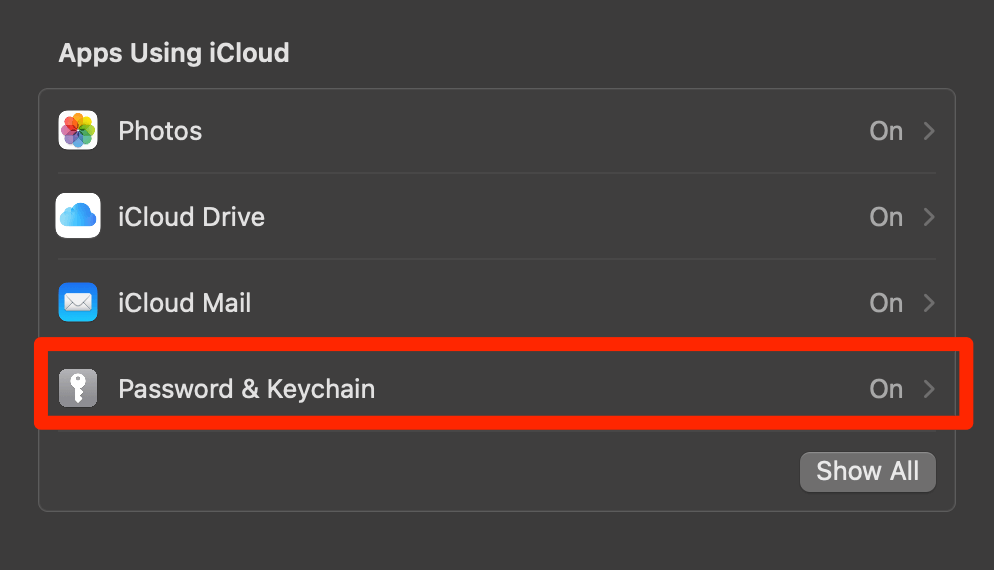 確保密碼和鑰匙串在“使用 iCloud 的應用程序”部分下打開。
