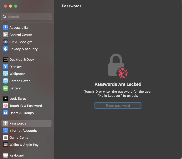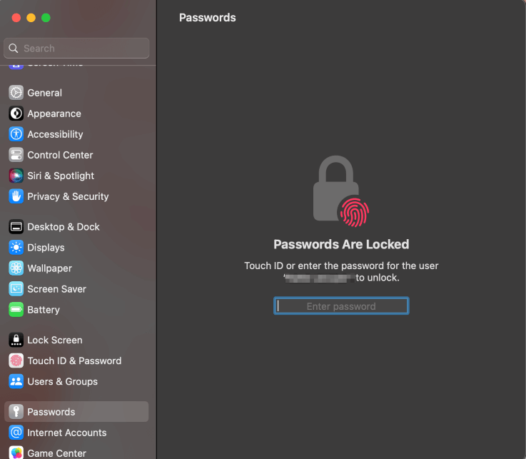 您的 MacBook 將自動打開“密碼”設置,並要求您輸入 Mac 密碼才能訪問信息。
