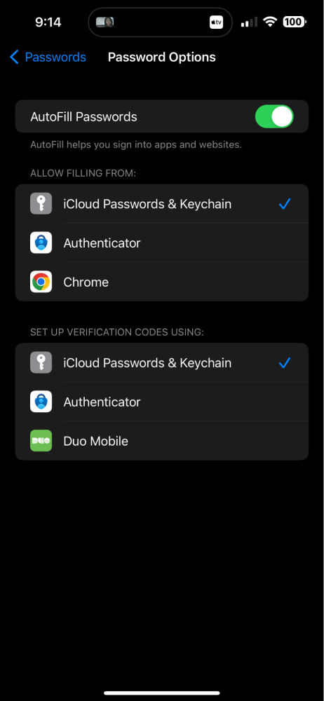 下一個,在“密碼”下,單擊“密碼選項”。確保自動填寫密碼已打開並且允許填充來自和設置驗證碼兩者同時使用iCloud 密碼和鑰匙串。