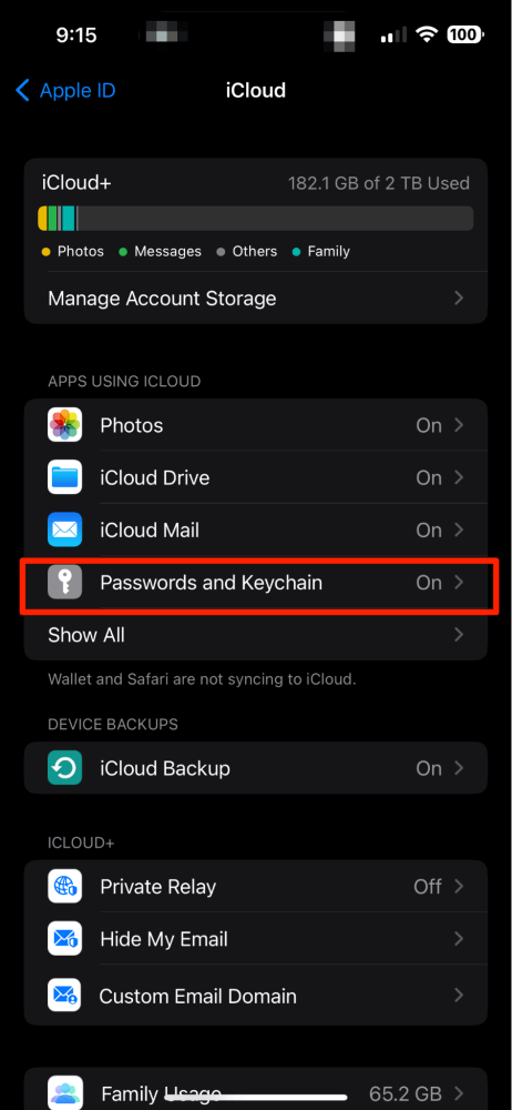 確保密碼和鑰匙串應用程序已打開在設置的“使用 iCloud 的應用程序”部分下。